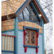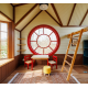 Внутри домика царит атмосфера радости и уюта. Благодаря огромному панорамному окну, пропускающему много солнечного света, пространство наполняется светом и теплом. Детская мебель, гармонично сочетающаяся с интерьером, придаёт ощущение комфорта. На втором мини-этаже можно расслабиться после активных игр, а на большом подоконнике с просторными окнами можно разместить любимые игрушки. Уголок с сундуком для игрушек и камином добавляют в домик тепла.